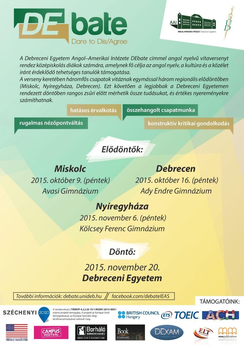 Háromfős csapatok mérik össze vitakultúrájukat a Debreceni Egyetem Angol-Amerikai Intézete által tavasszal meghirdetett DEbate című vitaversenyen, melynek elődöntőit Miskolcon (október 9.), Debrecenben (október 16.) és Nyíregyházán (november 6.) tartják.