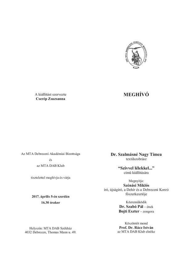 Textilszobrász műveiből nyílik kiállítás a DAB székházban Egyetem Kultúra április 3, 2017április 3, 2017Szabolcs SzilágyiSzóljon hozzá a Textilszobrász műveiből nyílik kiállítás a DAB székházban bejegyzéshez Dr. Szalmásné Nagy Tímea “Szívvel, lélekkel” című kiállítását nyitják meg április 5-én.