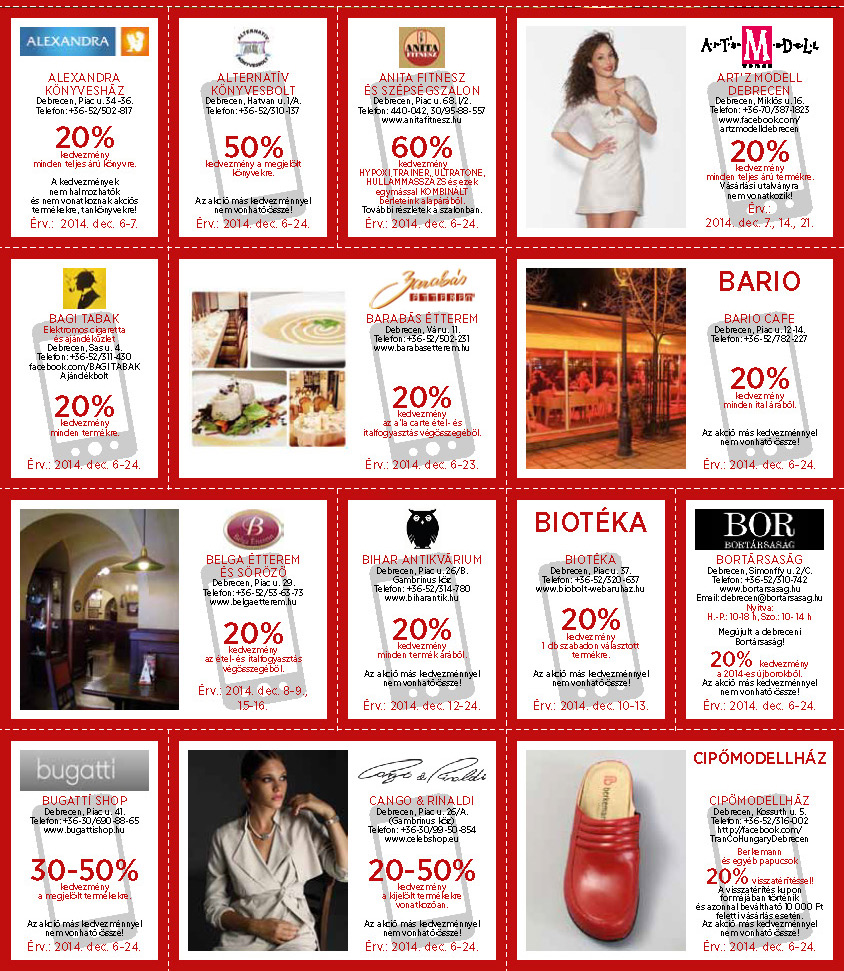 A belvárosi üzletek összehangolt kuponakciót hirdetnek 2014. december 6-24. között. Ebben az időszakban akár 80%-os kedvezménnyel lehet az akcióban részt vevő üzletekben vásárolni. Kattintson a kuponoldalra, töltse le és vágja ki a keresett kupont, majd fizetéskor adja át a pénztárnál.