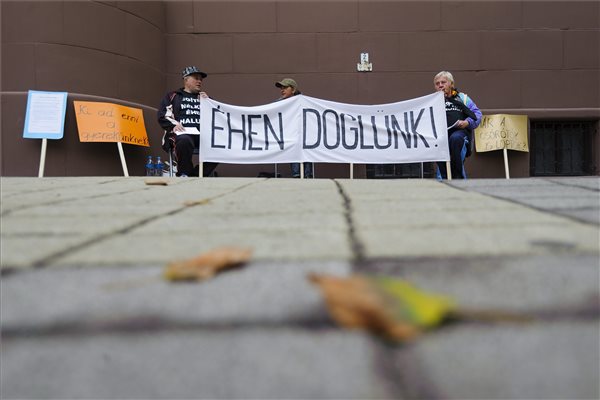 Az Első Magyar Környezettudatos Szociális Országos Szövetkezet (ESZOSZ) károsultjai ülősztrájkot tartanak a megyei kormányhivatal épülete előtt Debrecenben 2015. október 6-án. MTI Fotó: Czeglédi Zsolt