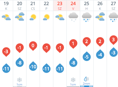 Kedden nyugat felől megnövekszik a felhőzet, hosszabb napos időszakok inkább csak északkeleten lehetnek. Számottevő csapadék nem várható, csak hószállingózás, gyenge hózápor fordulhat elő elszórtan. Gyenge, mérsékelt marad a szél. A hideg hajnalt követően nappal +1, -4°C várható.