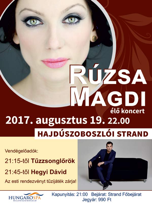 Rúzsa Magdi nem először ad élő koncertet Hajdúszoboszlón. Az elmúlt években többször járt a fürdővárosban és nagy sikerrel adott koncertet a városban. Az idei évben egyedi környezetben a hajdúszoboszlói strandon bulizhatsz Magdi slágereire.
