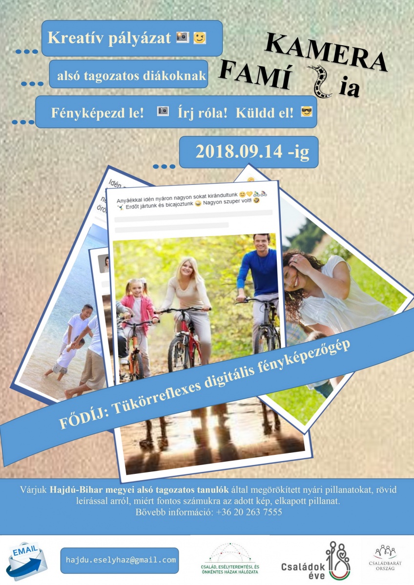 2018 a családok éve! A Hajdú-Bihar megyei Család, Esélyteremtő és Önkéntes Ház szervezésében meghirdetik a „Kamera Família” című kreatív fotópályázatot, Hajdú-Bihar megyei általános iskolák alsó tagozatos diákjai részére. Nevezni az alábbi témakörben lehet: Nyári családi fotó.