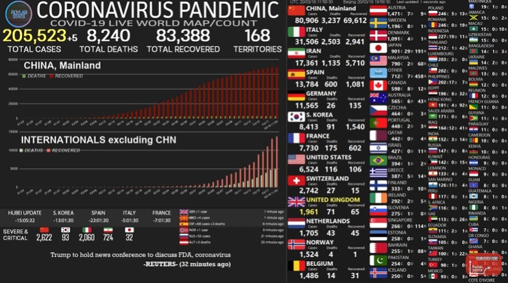 Az új típusú koronavírussal fertőzöttek száma már meghaladta a 200 ezret a Johns Hopkins Egyetem legfrissebb adatai szerint. A halálesetek száma 800 fölé nőtt, 83 ezer ember meggyógyult.