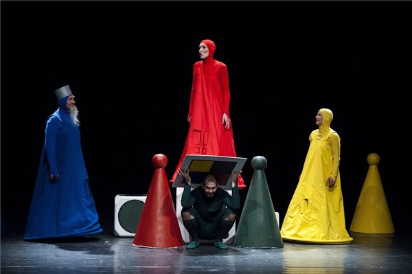 Bicskei István a király, Csillag Panni a királylány, Csillag Botond a királyfi és Horváth Zita a királyné (b-j) szerepében Gimesi Dóra A mindentlátó királylány című mesejátékának próbáján a debreceni Csokonai Nemzeti Színház Víg Kamaraszínházában 2015. november 16-án. A darabot Kolozsi Angéla rendezésében november 17-én mutatják be. MTI Fotó: Czeglédi Zsolt