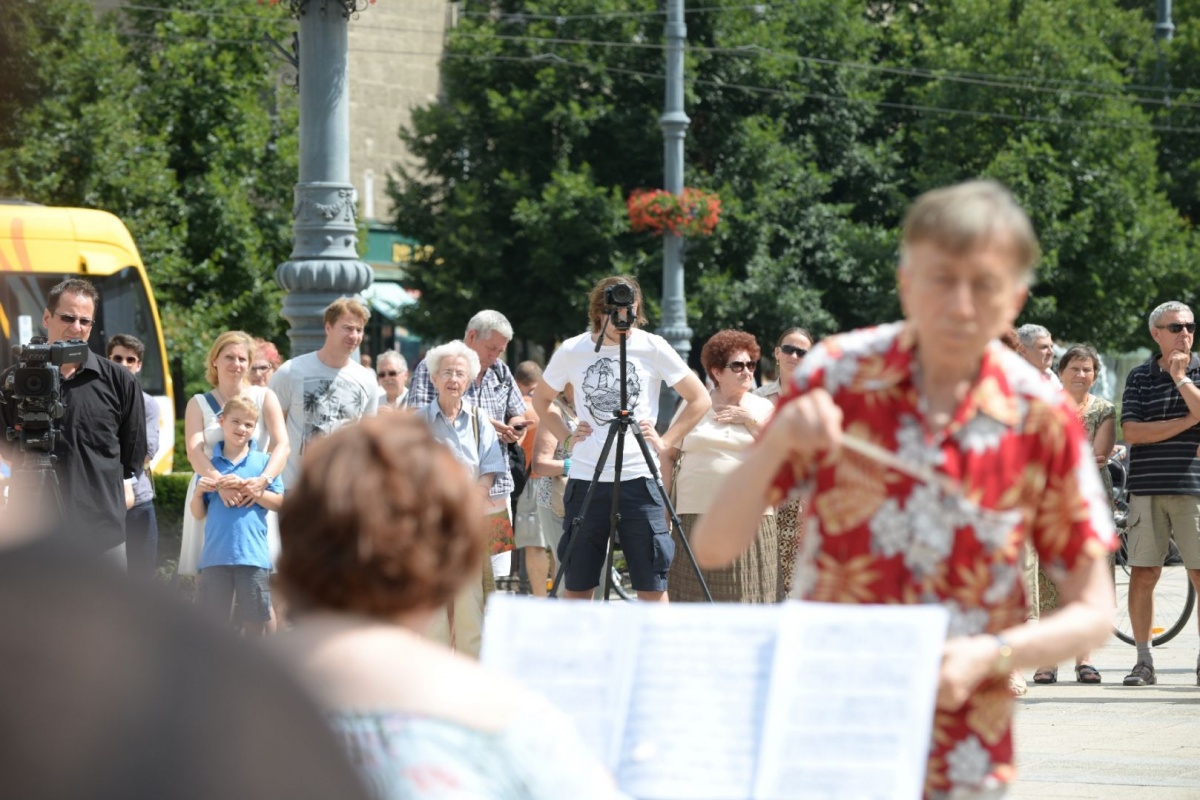 Rendhagyó helyszínen, a debreceni Kossuth téren léptek fel csütörtökön a Kodály Zoltán Ifjúsági Világzenekar tagjai. A villámcsődület nagy sikert aratott a járókelők körében.