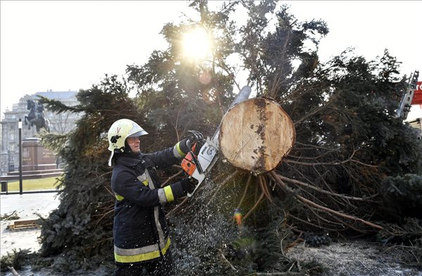 Tűzoltók darabolják fel az ország karácsonyfáját az Országház előtti Kossuth Lajos téren 2017. január 10-én. A fenyőfa feldarabolása után a faanyagot egy tűzoltó családjának adják, a kordont képező szánkókat pedig a rendvédelmi szervek hősi halottai gyermekeinek ajánlotta fel az Országgyűlés Hivatala. MTI Fotó: Illyés Tibor
