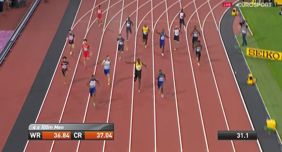 A nyolcszoros olimpiai bajnok jamaicai sprinter az esti program zárószámában a 4×100 méteres váltó utolsó embereként volt érdekelt: a 30 éves klasszis a harmadik helyen, viszonylag nagy hátrányban kapta meg a botot, láthatóan hihetetlen erőket kellett volna megmozgatnia a sikerhez, azonban körülbelül 20 méter után begörcsölt és összeesett. Bolt végül percekig feküdt a pályán, majd felkelt és az utolsó métereket sántikálva tette meg. A futamot nagy meglepetésre a britek nyerték.