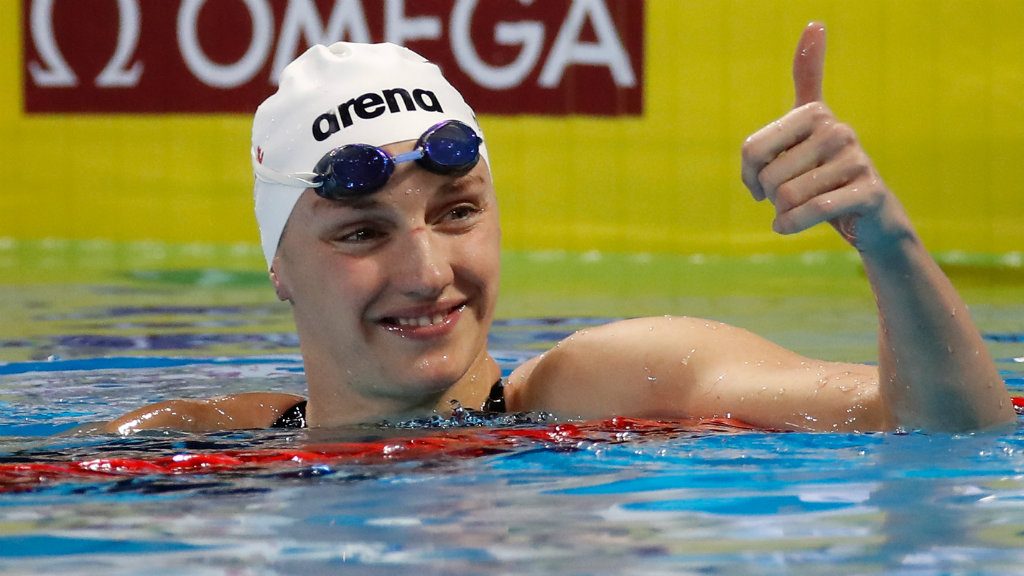 A nők 100 méter vegyesúszásában aranyérmes Hosszú Katinka az eredményhirdetésen a kínai Hangcsouban zajló rövidpályás úszó-világbajnokságon 2018. december 14-én. MTI/EPA/Roman Pilipej