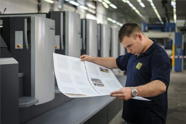 Egy dolgozó egy kinyomtatott ívet ellenőriz az újonnan üzembe helyezett nyolc nyomóműves Heidelberg nyomdagép mellett a debreceni Alföldi Nyomdában 2015. október 2-án. Ezen a napon került átadásra a nyomda közel 1,4 milliárd forintos beruházása, amelynek során a nyomdagép mellett új irkafűző és frontvágó gép került beszerzésre. MTI Fotó: Czeglédi Zsolt