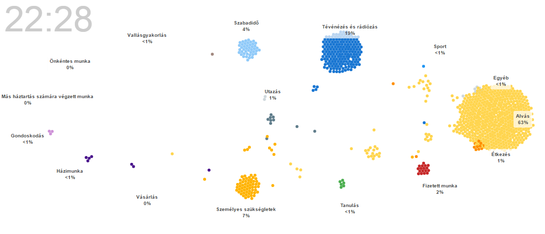 Látványos interaktív oldalt készített a KSH, amiben a 2009 és 2010 között, ezer fős mintán felvett háztartási időmérleget ábrázolták. Egész pontosan azt, hogy a minta alapján hogy néz ki egy magyar ember 24 órája.Kiderül, mikor alszik a többség, mikor néznek legtöbben tévét, és mely napszakban végzünk fizetett és önkéntes munkát. Az alkalmazás ide kattintva érhető el.