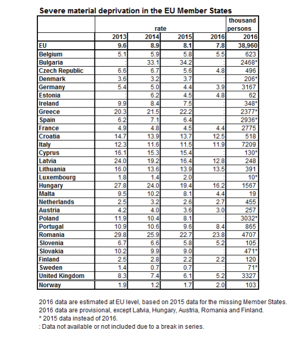Az Eurostat felmérése szerint ma hazánkban a lakosság 16.2 százaléka, bő másfél millió ember tartozik a legsúlyosabb nélkülözők közé, ennél rosszabb csak Romániában rosszabb a helyzet, ahol ugyanez az arány 23.8 százalék.A 2016-os adatok szerint az Európai Unió lakosságának 7.8 százaléka, közel 39 millió ember él súlyos nélkülözésben.