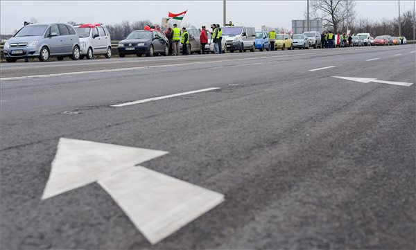 Tiltakozók félpályás útlezárása a 4-es főút és az M35-ös autópálya kereszteződésének közelében 2015. január 16-án. Az M35-ös autópálya a 4-es főút csomópontjától az ondódi lehajtóig húzódó, útdíjkötelessé vált.