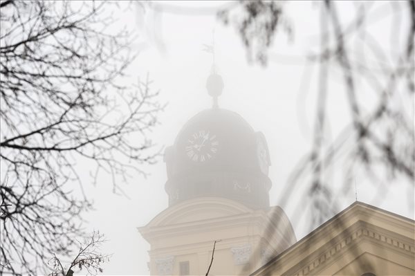 A debreceni református nagytemplom egyik tornya a sűrű ködben 2015. december 26-án. Az Országos Meteorológiai Szolgálat előrejelzése szerint a hétvégén elsősorban a Dunától keletre lehetnek rossz látási viszonyok, tartósan ködös idő, néhol szitálás is előfordulhat.