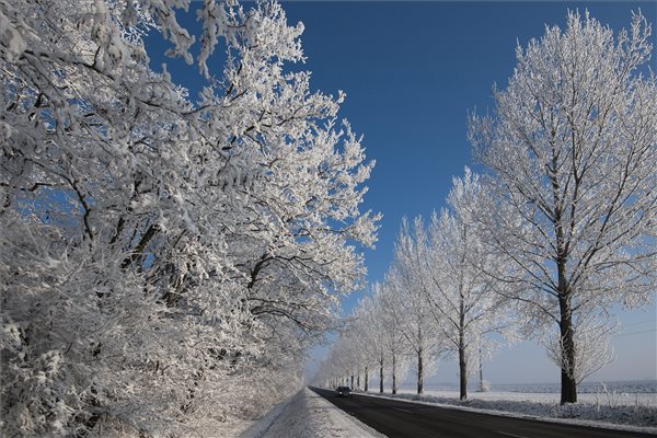 Zúzmarás fák havazás után Hajdúszovát közelében 2016. január 23-án. MTI Fotó: Czeglédi Zsolt