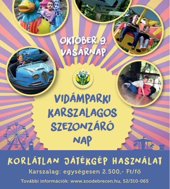 Egy szezonbúcsúztató önfeledt napra várja a vidámpark szerelmeseit a Nagyerdei Kultúrpark. Vasárnap egy 2500 forintos karszalag megvásárlásával a látogatók korlátlanul használhatják a park játékait. A vidámpark 9-től 18 óráig tart nyitva.