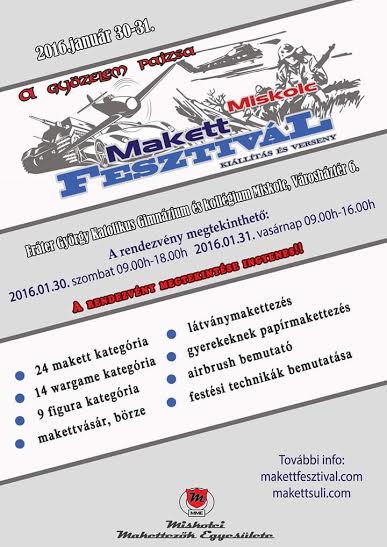 A Miskolci Makettezők Egyesülete sok szeretettel várja Önt és kedves családját 2016. január 30-31-én, az immáron 5. alkalommal megrendezésre kerülő makettkiállítás és versenyre. A rendezvény Miskolcon a Fráter György Katolikus Gimnázium épületében lesz.