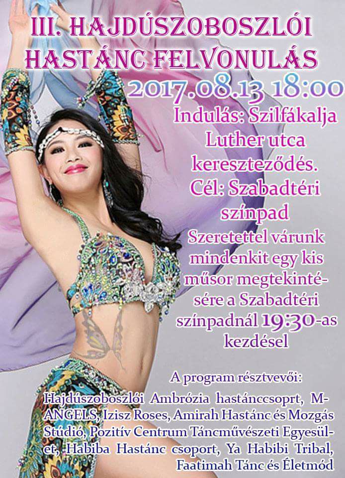 A hajdúszoboszlói Ambrózia Hastánccsoport szervezésében augusztus 13-án Hastánc felvonulás lesz, mely 18.00 órakor indul el Szilfákalja – Luther utca kereszteződéséből, majd a táncosok végig haladnak a Szilfákalján és zárásként a Szabadtéri színpadra érkezve, egy hangulatos műsorral várják majd az érdeklődőket, amely 19.30-kor kezdődik.