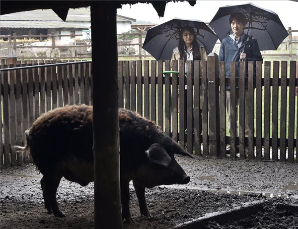 Akisino japán herceg (j) és lánya, Mako hercegnő megtekint egy mangalicát Bugacon 2017. augusztus 20-án. A herceg, Akihito császár másodszülött fia a haszonállatok házasításáról végez kutatásokat.  Fotó: Máthé Zoltán/MTI