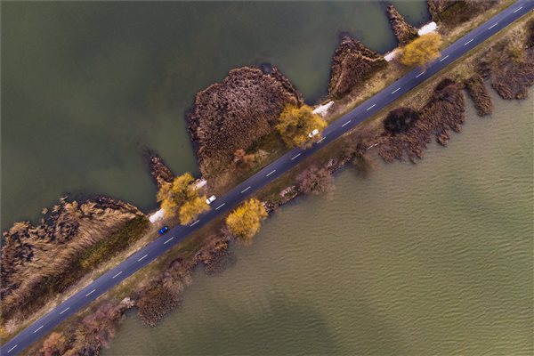 Így néz ki madártávlatból a Kis-Balaton. A zalavár-zalaszabari töltés a Kis-Balatonon 2018. december 29-én.  Fotó:  MTI/Varga György