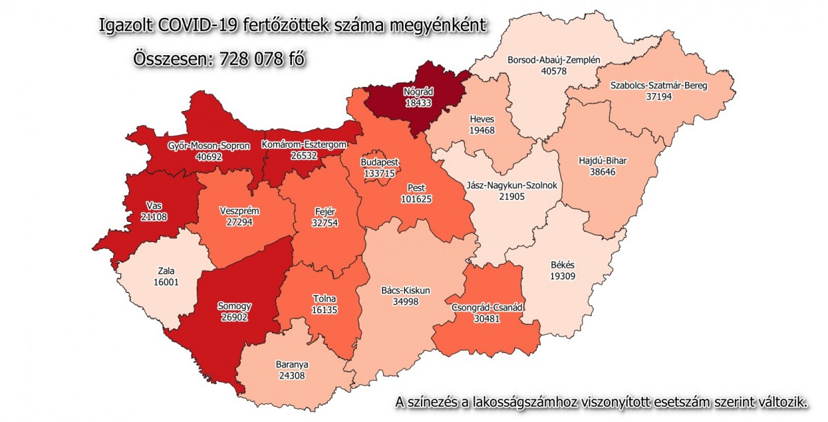 A kormányzati portálon azt írták: 728 068-ra nőtt a Magyarországon azonosított fertőzöttek száma. Az elhunytaké 23 980-ra, a gyógyultaké 431 124-re emelkedett.