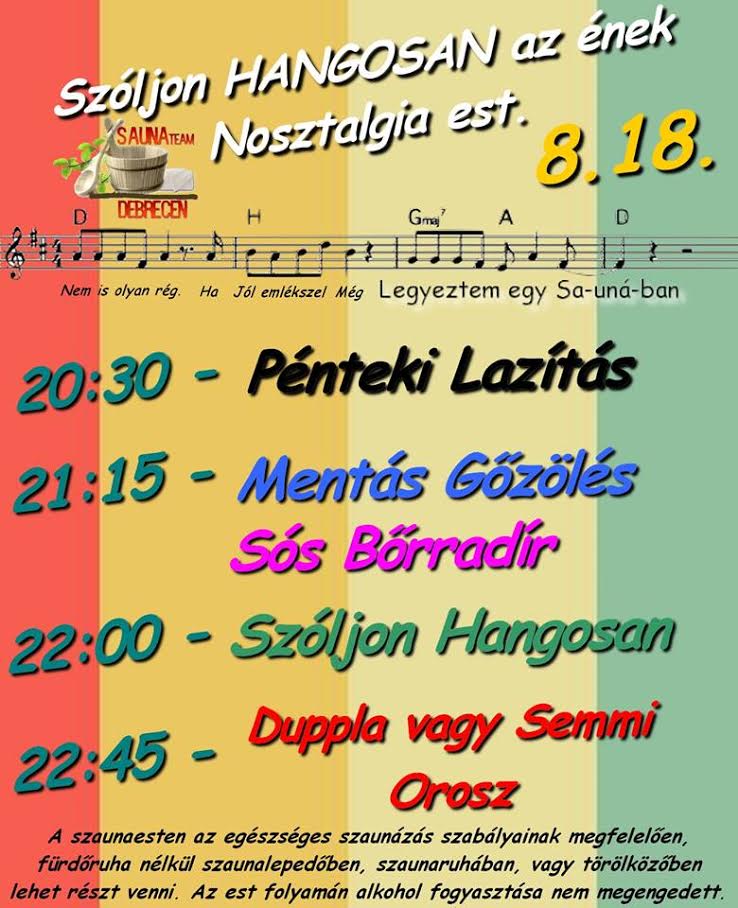 Pénteken magyaros est és gőzölés a Szaunavilágban Wellness augusztus 16, 2017Szabolcs SzilágyiSzóljon hozzá a Pénteken magyaros est és gőzölés a Szaunavilágban bejegyzéshez Pénteken magyaros esttel és gőzprogrammal is vár az Aquaticum Szaunavilág.